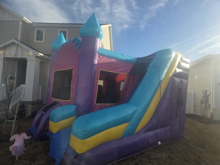 Our NEW 6-in-1 Princess Combo unit is a blast! With its beautiful pink and purple color theme, this 6-in-1 Castle Combo Wet or Dry will spark that sense of familiarity and recognition of a fun product. This Wet or Dry combo ride features six different obstacles activities: (1) a bigger bouncing area; (2) a basketball hoop; (3) inflated push-through, obstacle pop-ups; (4) a wall climber; (5) a “high platform” wet or dry slide; and (6) a removable pool/landing for wet use.